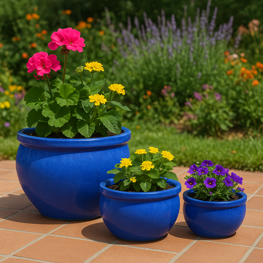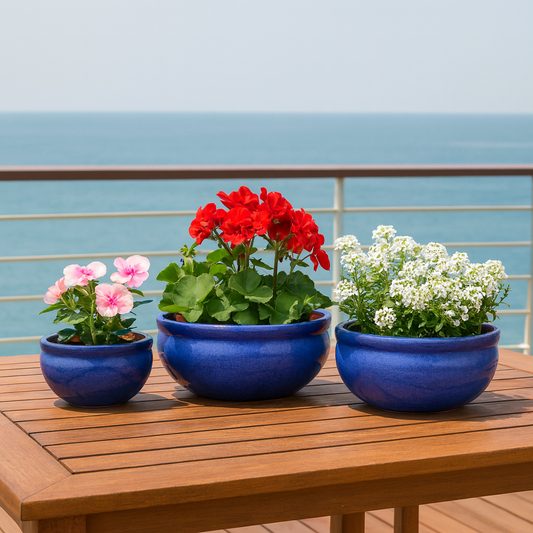 Blumentopf / Pflanzgefäß „3er Set Schale“ – Glasierte Steinguttöpfe in Blau, frostfest & handgefertigt